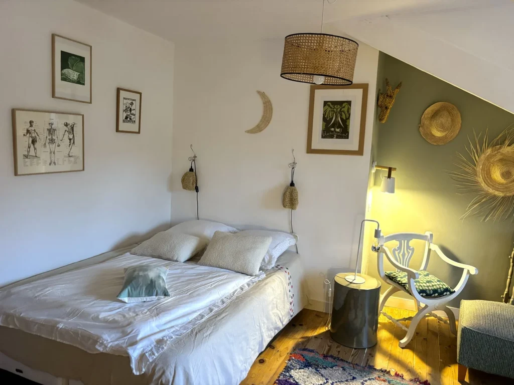 Une suite parentale de 25 m², lumineuse et élégante, vue jardin, avec lit de 160×190 cm, salle de bain attenante. Elle mêle éléments chinés et touches de modernité dans un esprit cabane raffinée.
