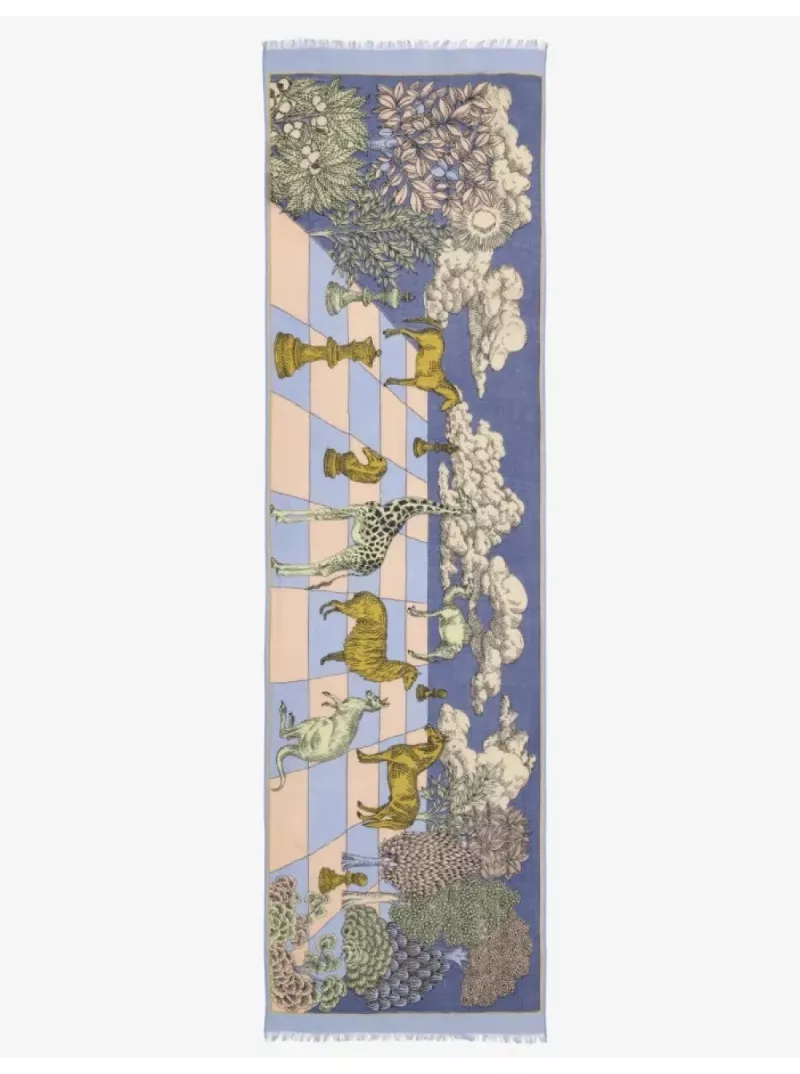 Dessin animalier pour cette magnifique étole en laine Magnus, un jeu d’échecs animalier avec une précision inégalée du dessin.